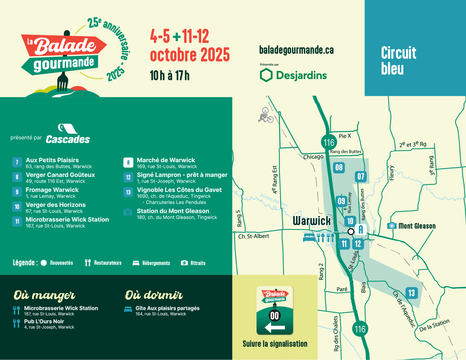 Arpentez les splendides routes parsemées de couleurs d’automne et laissez-vous charmer par une panoplie de produits plus gourmands les uns que les autres entre Warwick et Tingwick. Vergers, canard, boucherie, microbrasserie, grandes cultures, produits de l’érable, vignoble & fromagerie !